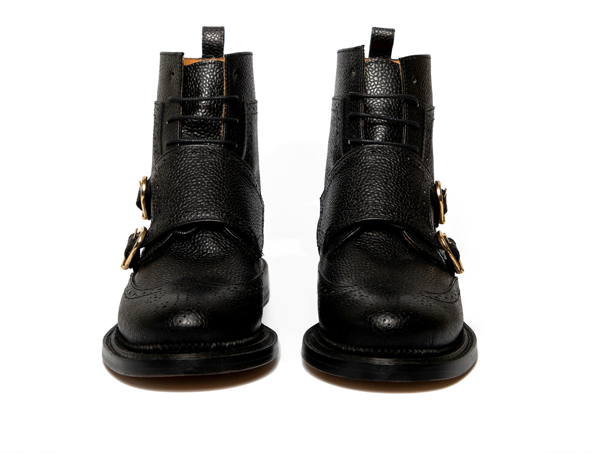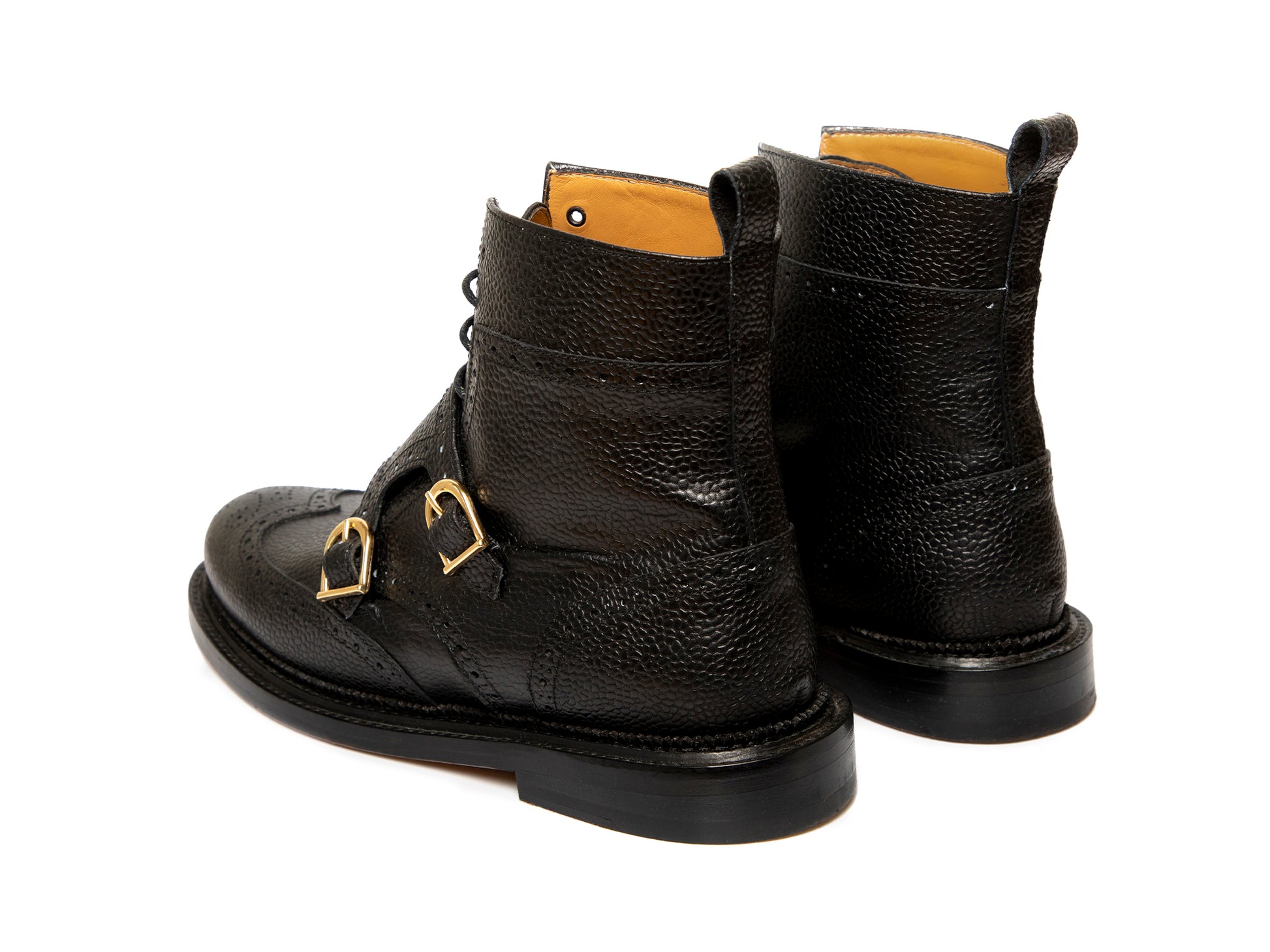 BUFFY, in black, is the perfect androgynous boot, its menswear inspired style can be paired with anything, from some slim fitting trousers to a contrasting feminine dress. BUFFY was expertly crafted from a quality pebble grain Spanish leather that will mould to your foot as you wear her. She is a solid black wing tipped Derby boot with a double monk strap, round toe and perforated brogue detailing. She was designed as a classy combat boot, the double monk strap, wing tip and formality contrast with the sturdiness of the leather and the masculinity of the boot. The shaft is the perfect height so that it doesn't dig against the back of your calf.
