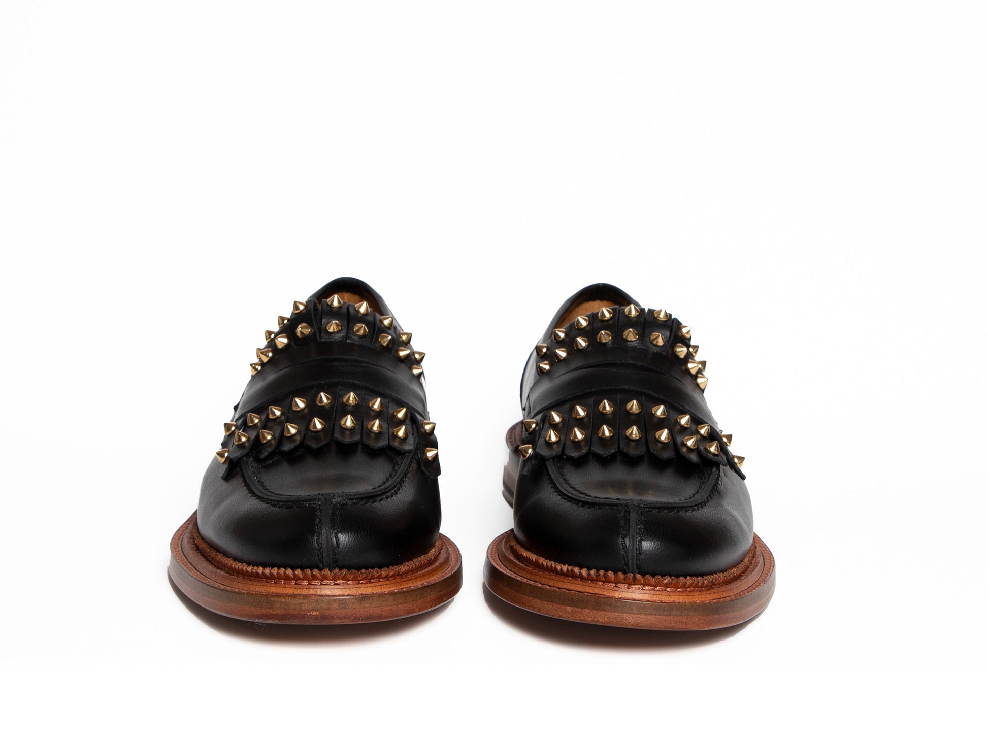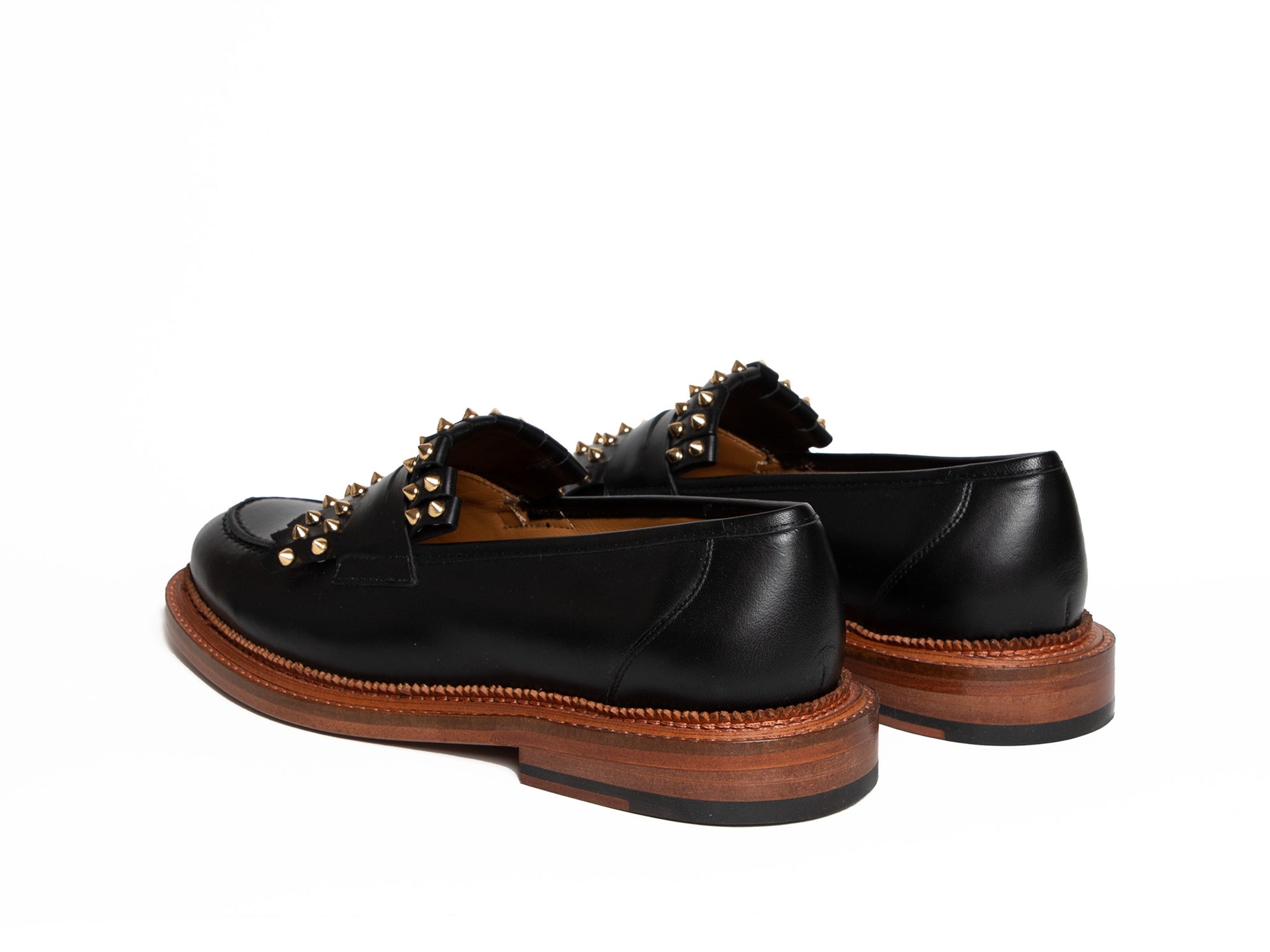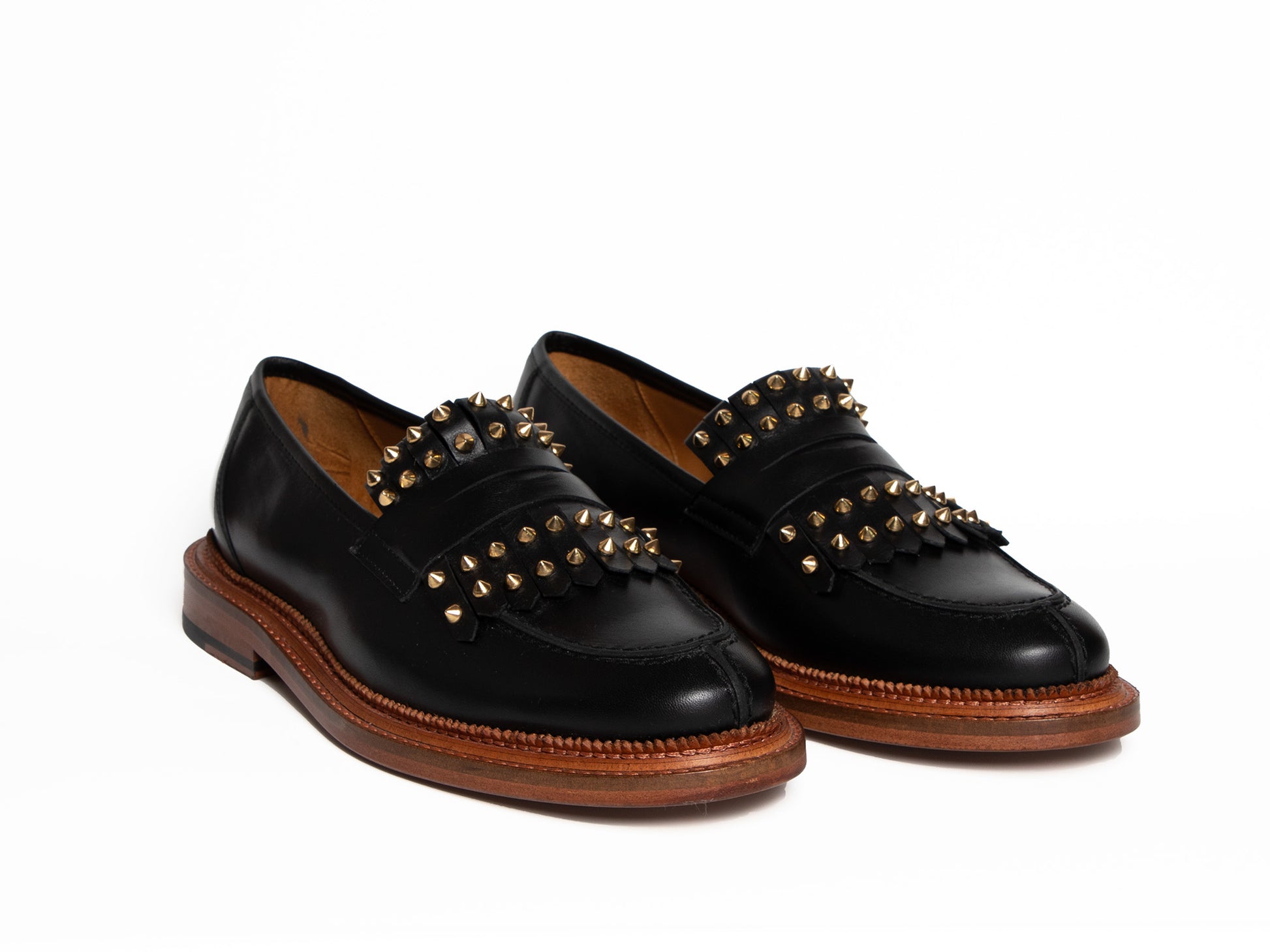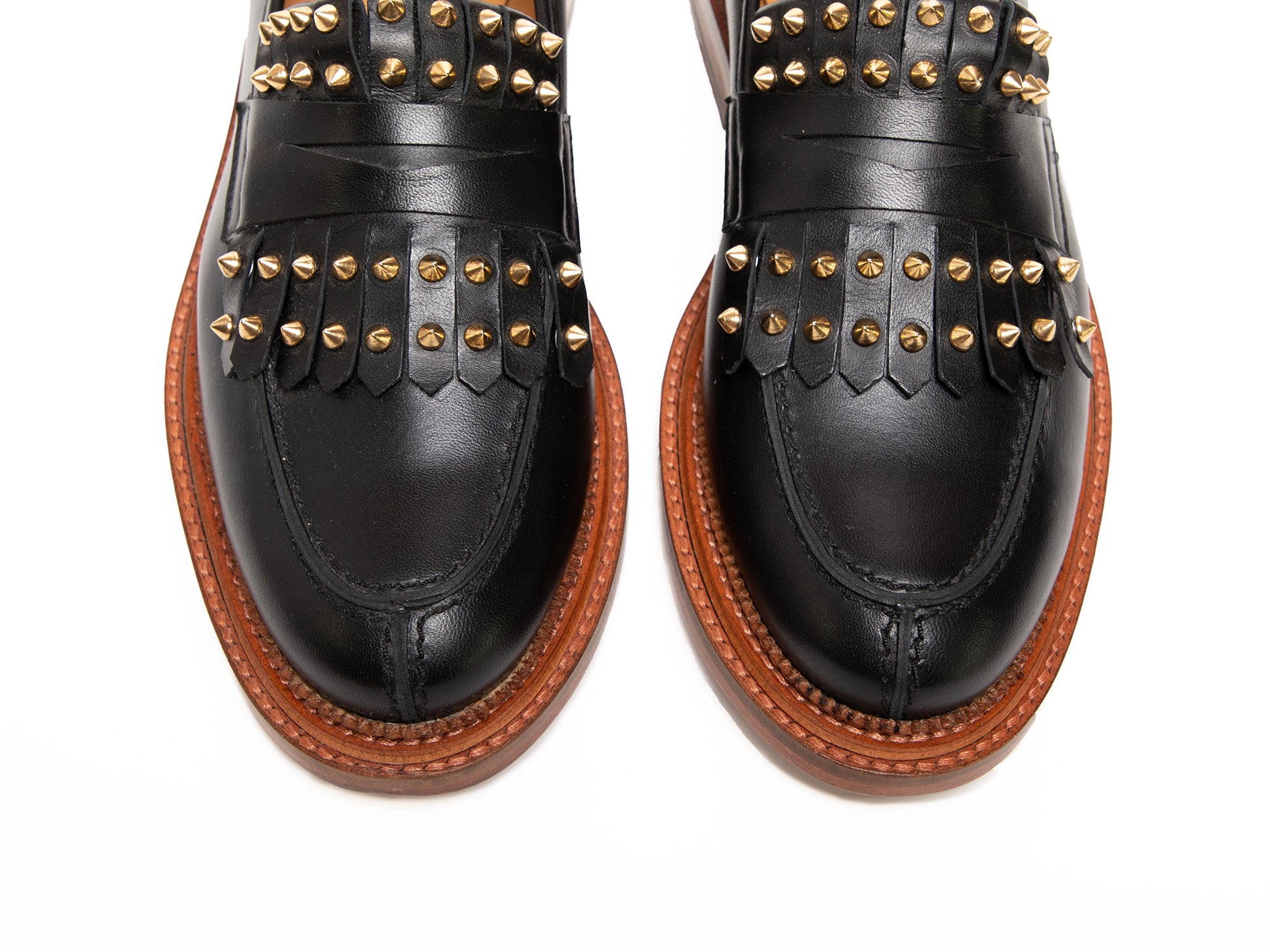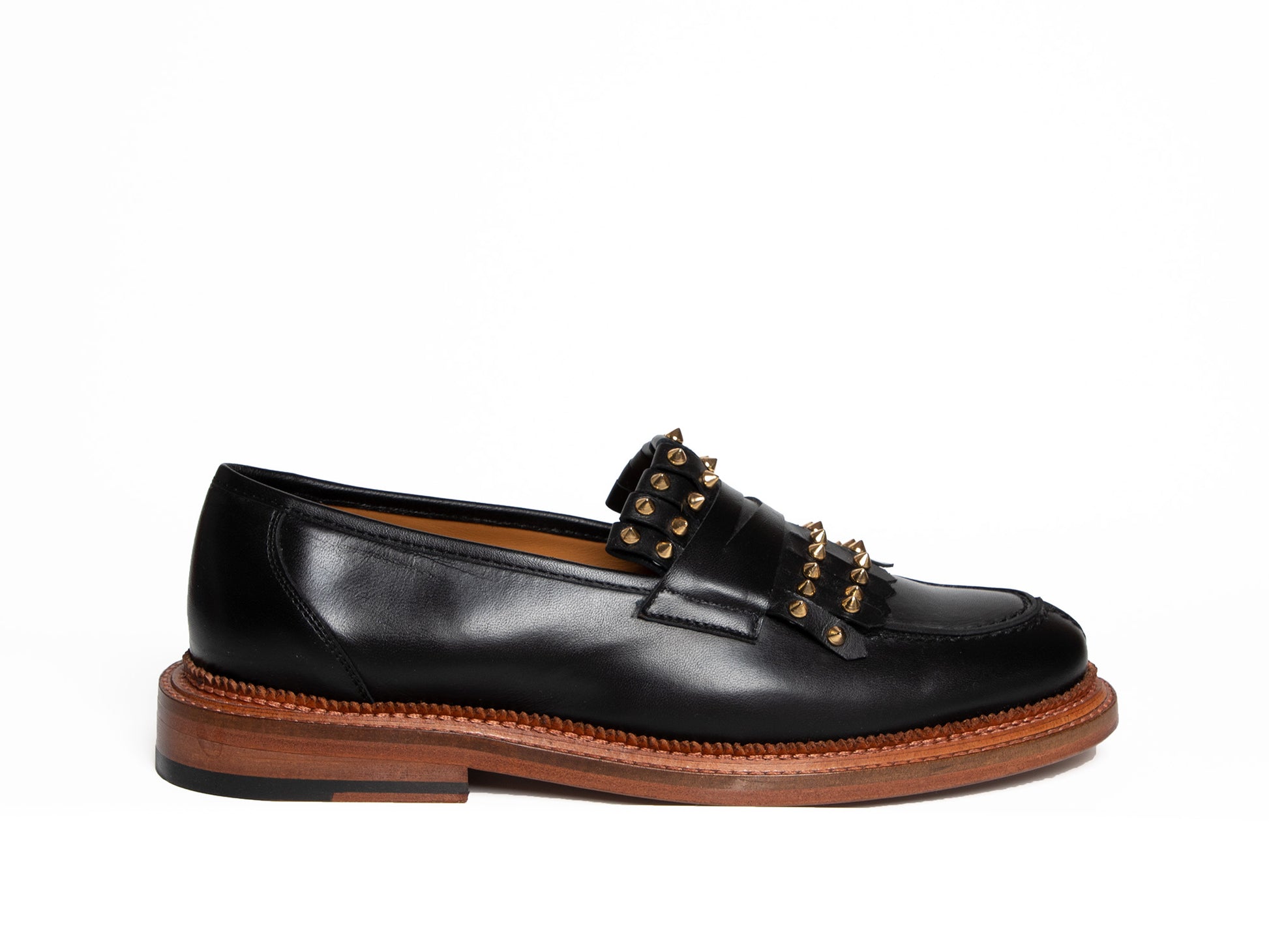 LILY, our first penny loafer was constructed out of soft black leather. Borrowed from the boys she is a refined silhouette with a twist. Handcrafted in Spain it takes around 10 mins just to put the gold studs on the fringed kiltie. And with thick brown leather soles you can wear them with anything. Wear them casually with cute socks and a skirt or rolled up jeans and tennis socks, or more formally with suit and tie or simple black dress. Our extended size range means you don't need to pine over this uniquely androgynous style.